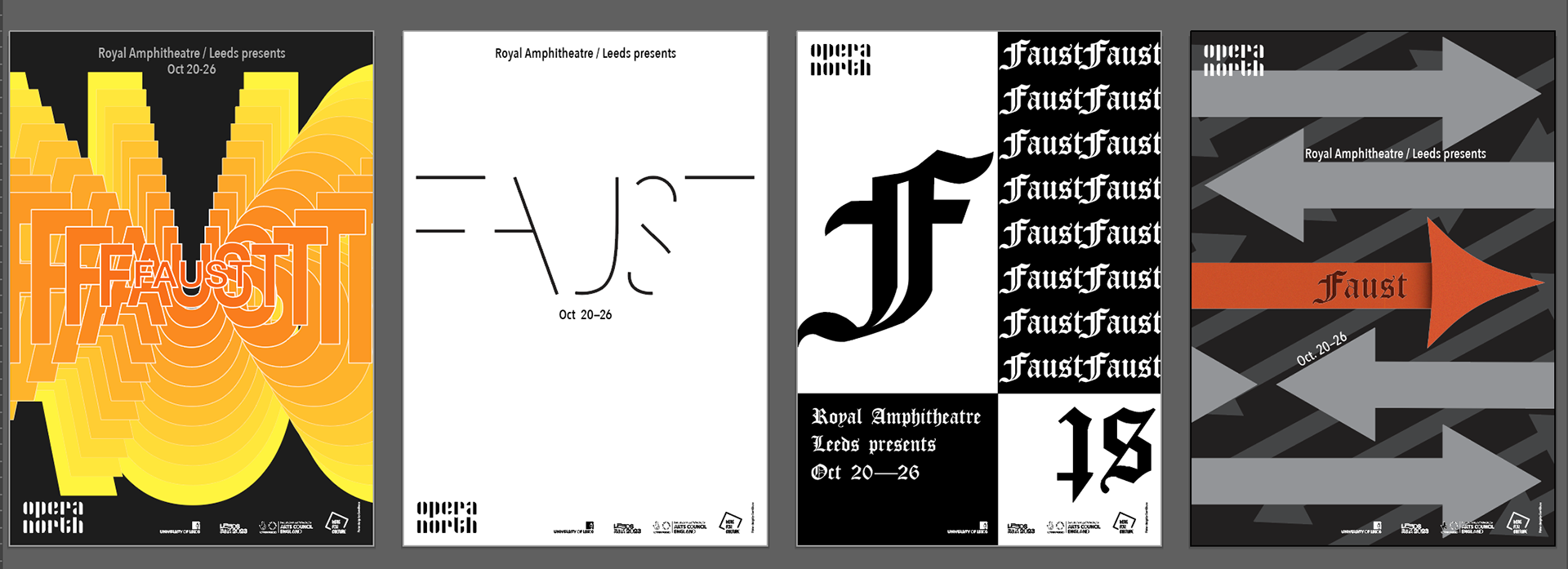 Digital roughs for a poster for "Faust" the opera at the Royal Amphitheatre in Leeds, England. Made using Illustrator. (2024)